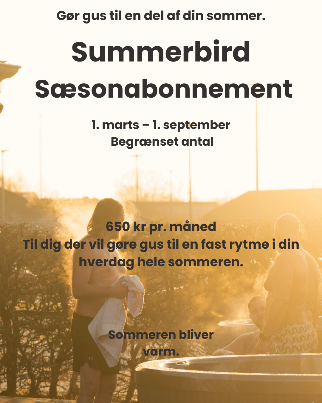 Summerbird Sæsonabonnement giver dig fri adgang til vores saunagus fra 1. marts til 1. september. Skabt til dig, der ønsker kontinuitet, varme og fællesskab som en naturlig del af din rytme. Du for adgang til 1 x saunagus om dagen samt til alle vores faciliteter.